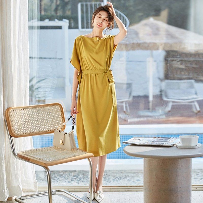 Lady唐黄色一字领连衣裙通勤2021夏设计感蝙蝠袖宽松系带过膝长裙热门设计联盟服务商