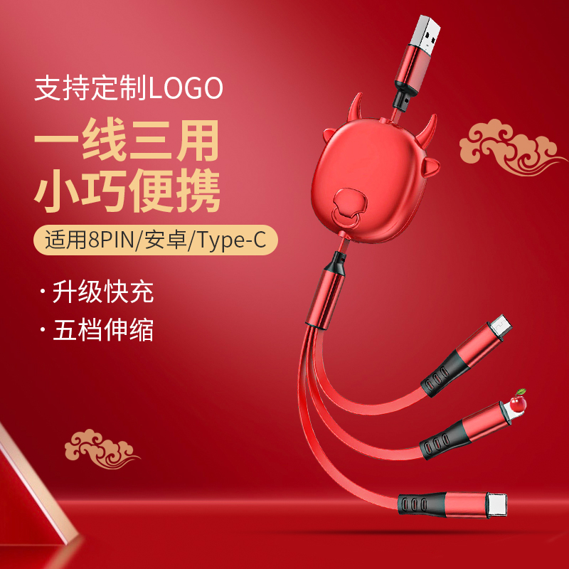 牛年礼品牛头一拖三数据线三合一usb充电线适用苹果安卓定制logo热门设计联盟服务商